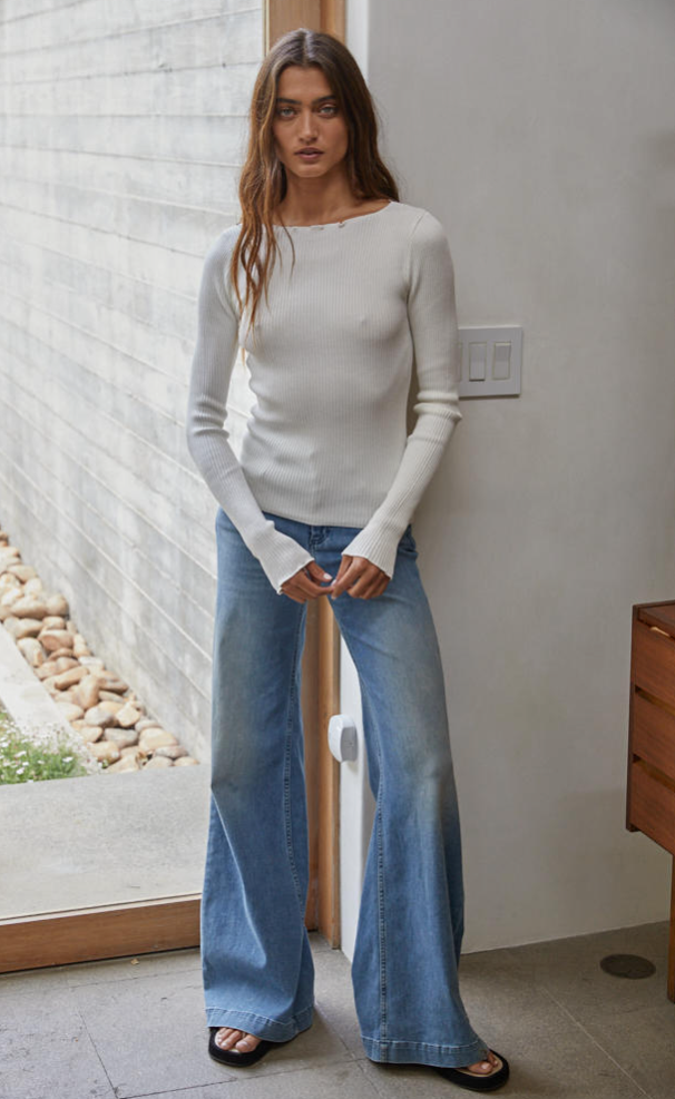 Crafted from a soft and stretchy ribbed knit, the Arianna Top features a flattering silhouette with a unique distressed round neckline. Its simple yet sophisticated design makes it perfect for layering or wearing on its own as a statement piece.