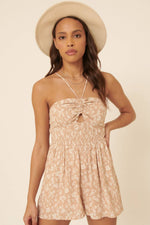 Embrace the essence of summer with this charming floral-print romper. The ruffled V-strap neckline, smocked waist, and flared leg holes create a playful and feminine silhouette. Adjustable cami straps and a smocked low back ensure a comfortable and perfect fit.
